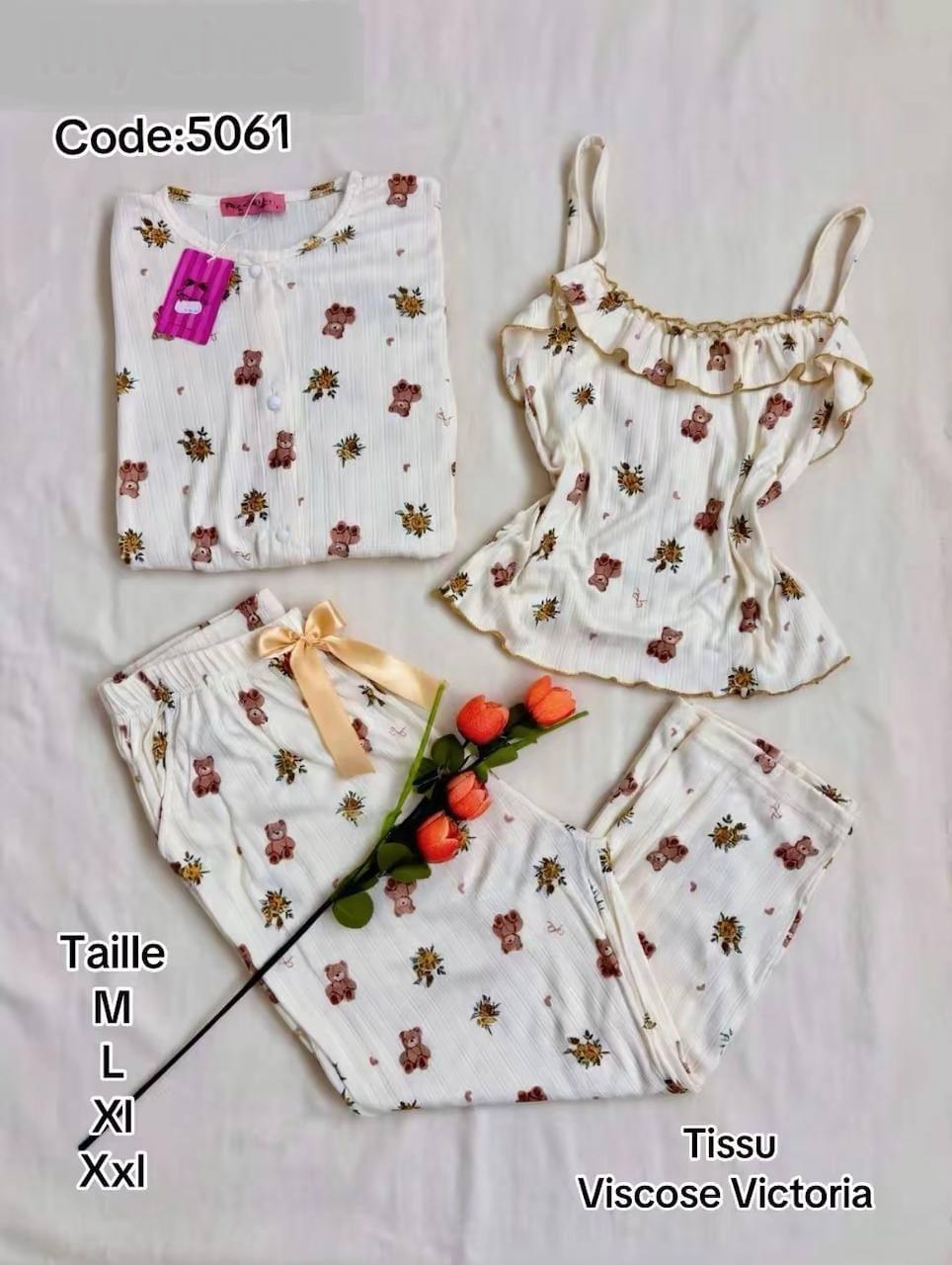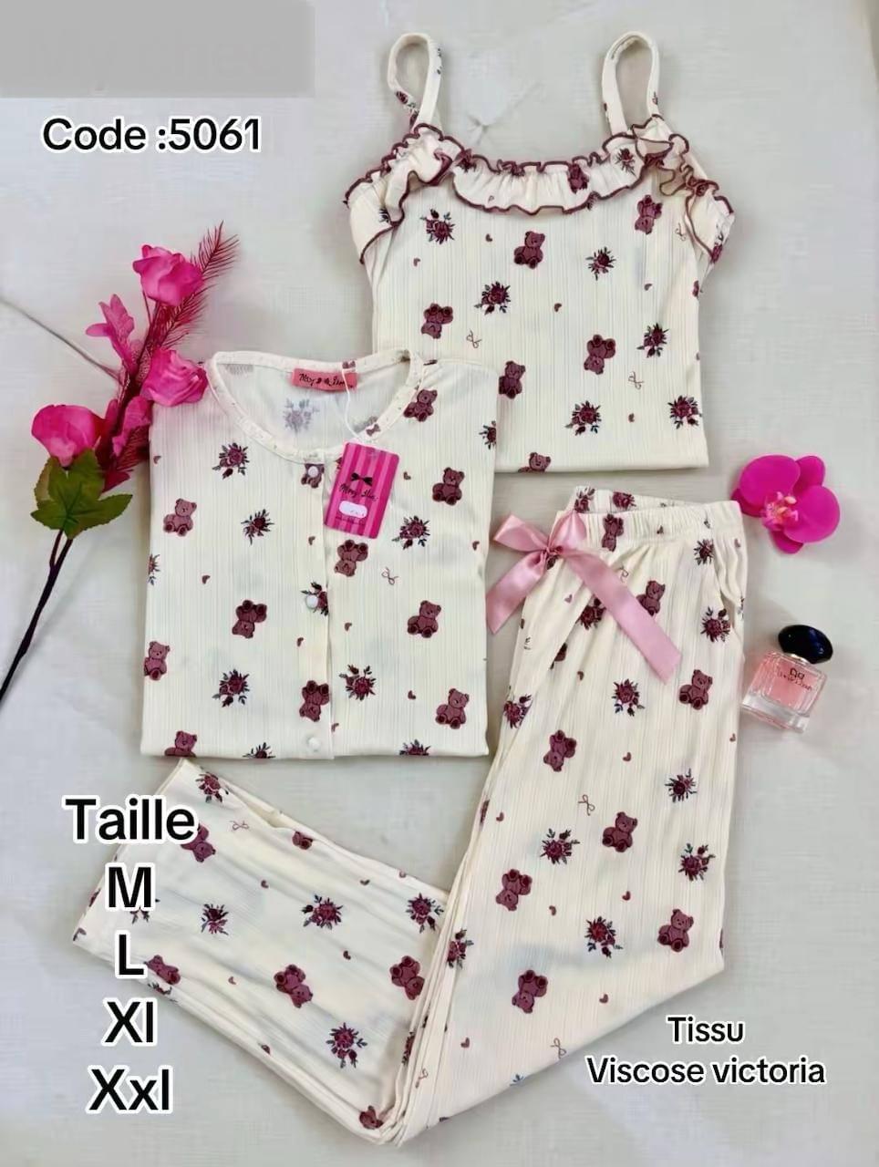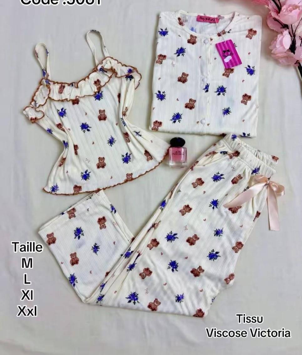 استمتعي بإطلالة ناعمة وكيوت مع هاد ensemble pyjama المكون من 3 pièces، مثالي للنوم أو الاسترخاء فالدار. التصميم ديال الدببة الصغيرة كيضيف لمسة girly و adorable.